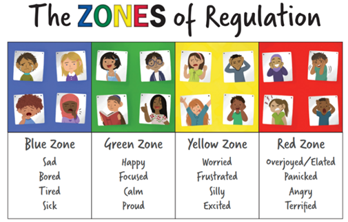 Zones of Regulation - when students return to learning from playtime, they identify one of 4 Zones of Regulation they are in. Our staff have been trained to provide support for students needing emotional regulation to prepare them for learning. This develops students’ emotional literacy and regulation skills.